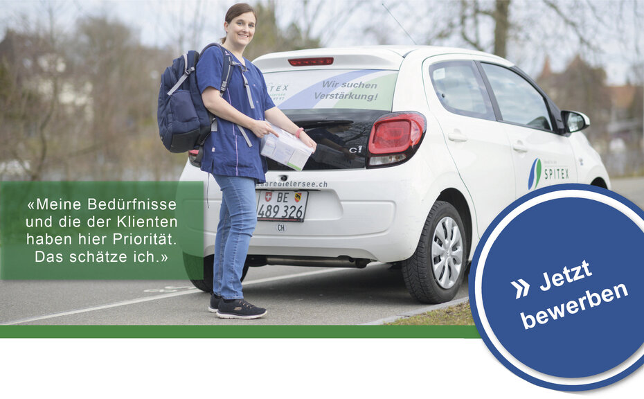 Tätigkeit der ambulanten Pflege – auch Wiedereinsteiger/innen sind herzlich willkommen. Wir unterstützen dich bei Weiterbildungen und ermöglichen dir, deine Kompetenzen zu erweitern. Mit unseren attraktiven Arbeitsbedingungen, z.B. mit fixen Diensten und Tagen, lassen sich Beruf, Familie und Weiterbildungen gut vereinbaren. Pensum nach Absprache.